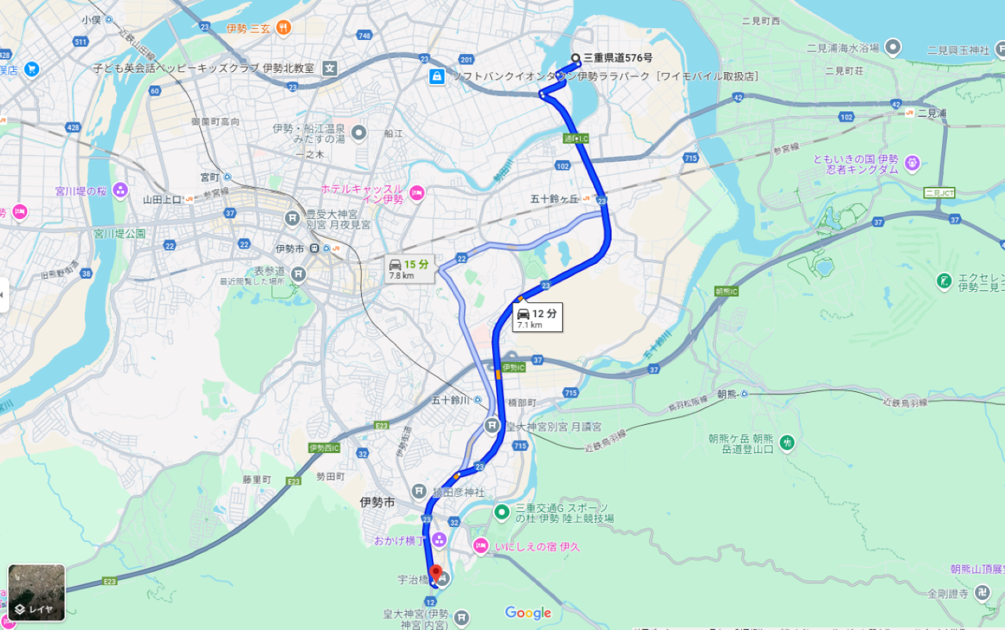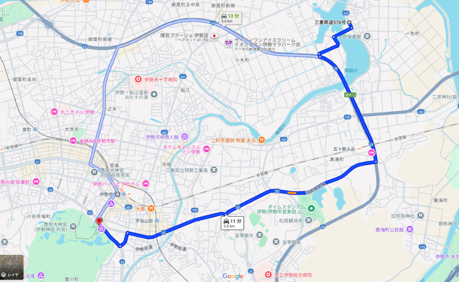 | | 内宮ルート 駐車場は内宮手前約1.2㎞R23号と五十鈴川との間に 多く有ります。 大きいサイズは五十鈴川東側の駐車場が便利です。 |